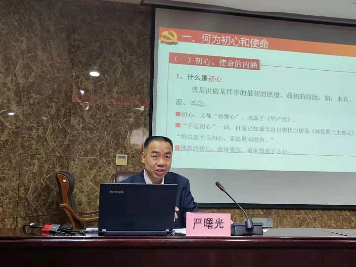 严曙光从何为初心和使命、中国共产党的初心和使命、坚定信念跟党走三个方面进行了深刻的阐述,为大家上了一堂生动的党课。他从初心和使命的内涵出发,娓娓道来,分析了不同政党、不同个人的初心和使命,讲述了什么是中国共产党的初心和使命、指出了为什么要不忘初心、牢记使命以及怎样才能不忘初心、不辱使命。他强调,要坚定理想信念,加强党性修养,永远跟党走,要以“不忘初心、牢记使命”主题教育学习为契机,深刻领会习近平新时代中国特色社会主义思想,用习近平新时代中国特色社会主义思想武装头脑、指导实践、推动工作,在干事创业中找方法、寻路子,努力练就新本领、学会新功夫,主动作为,不断谱写新篇章。