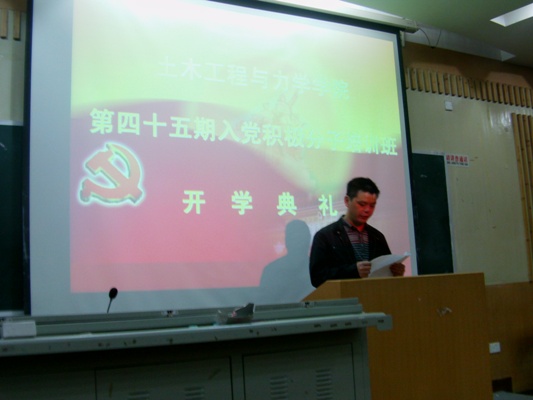 2010年11月21日上午,土木工程与力学学院第四十五期入党积极分子培训班开学典礼在经干一教学楼一楼阶梯教室隆重举行。出席开学典礼的领导有:学校党校专职副校长王红艳、学院、党总支书记刘梦飞、分党校副校长、党总支副书记蒋炳春。开学典礼由学院副处级组织员余峰主持。